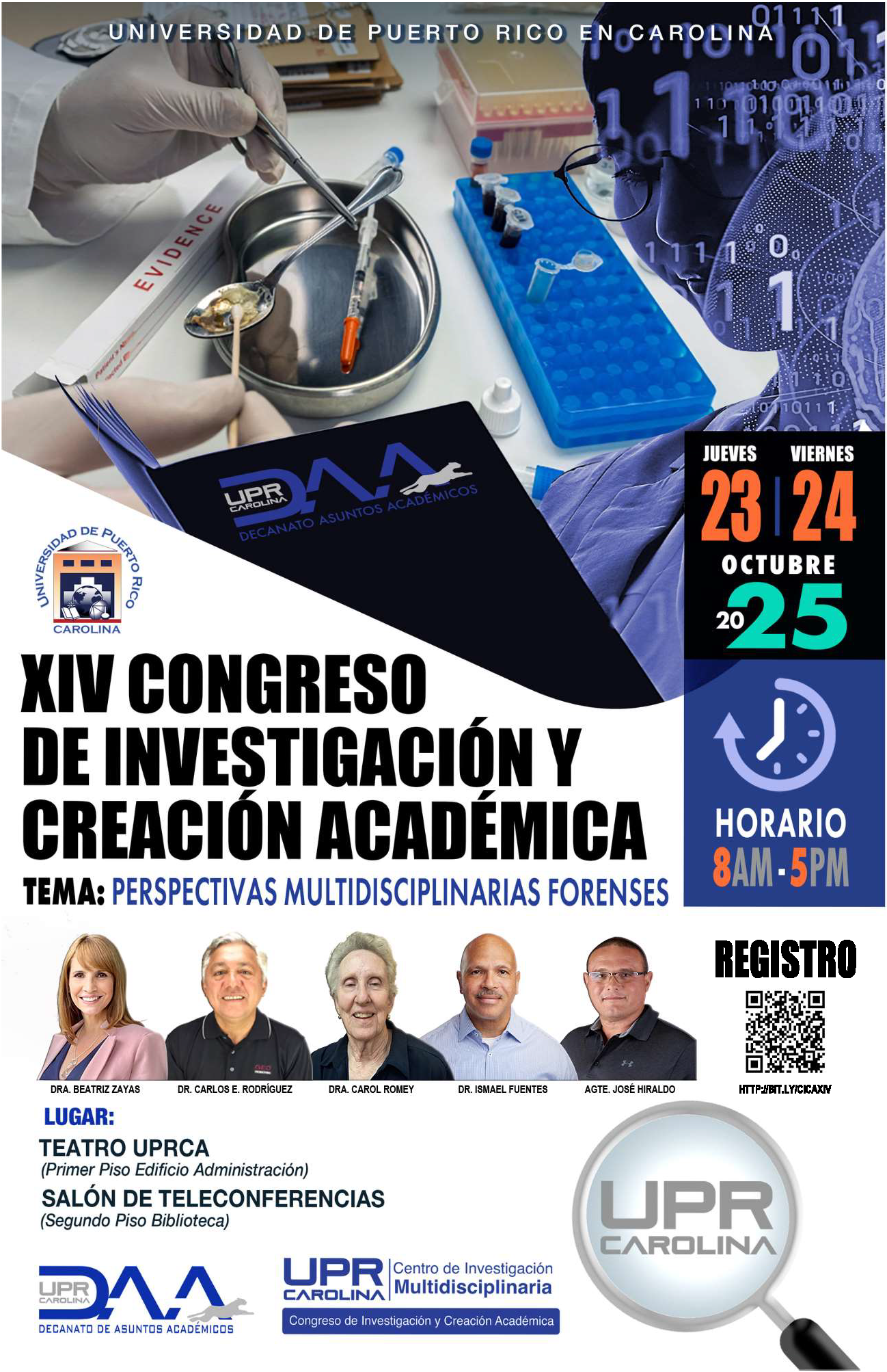 El Decanato de Asuntos Académicos y el Centro de Investigación Multidisciplinaria (CIMU), a través del Comité Institucional para la Investigación y Creación Académica (CICA) de la Universidad de Puerto Rico en Carolina les invitan al XIV Congreso de Investigación y Creación Académica: «Perspectivas Multidisciplinarias Forenses» a llevarse a cabo los días jueves 23 y viernes 24 de octubre de 2025 de 8:00 a.m. a 5:00 p.m. en la Universidad de Puerto Rico en Carolina.
